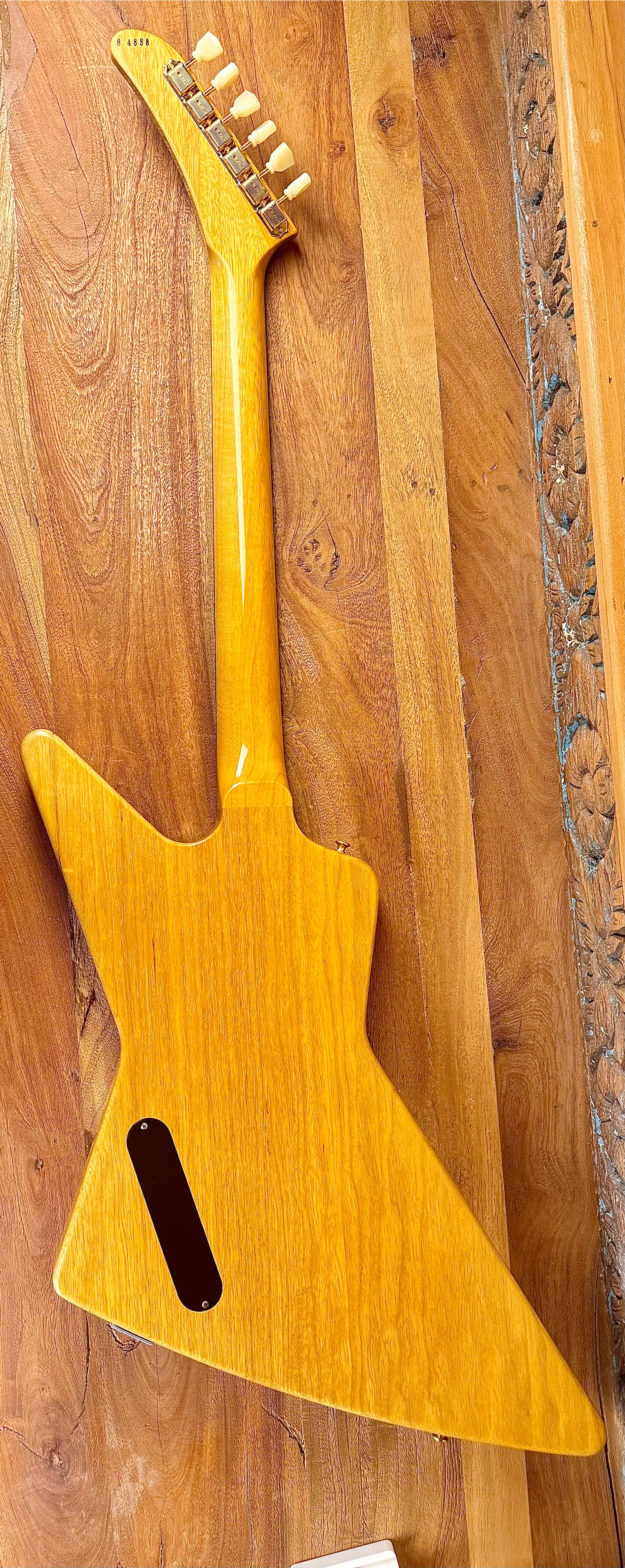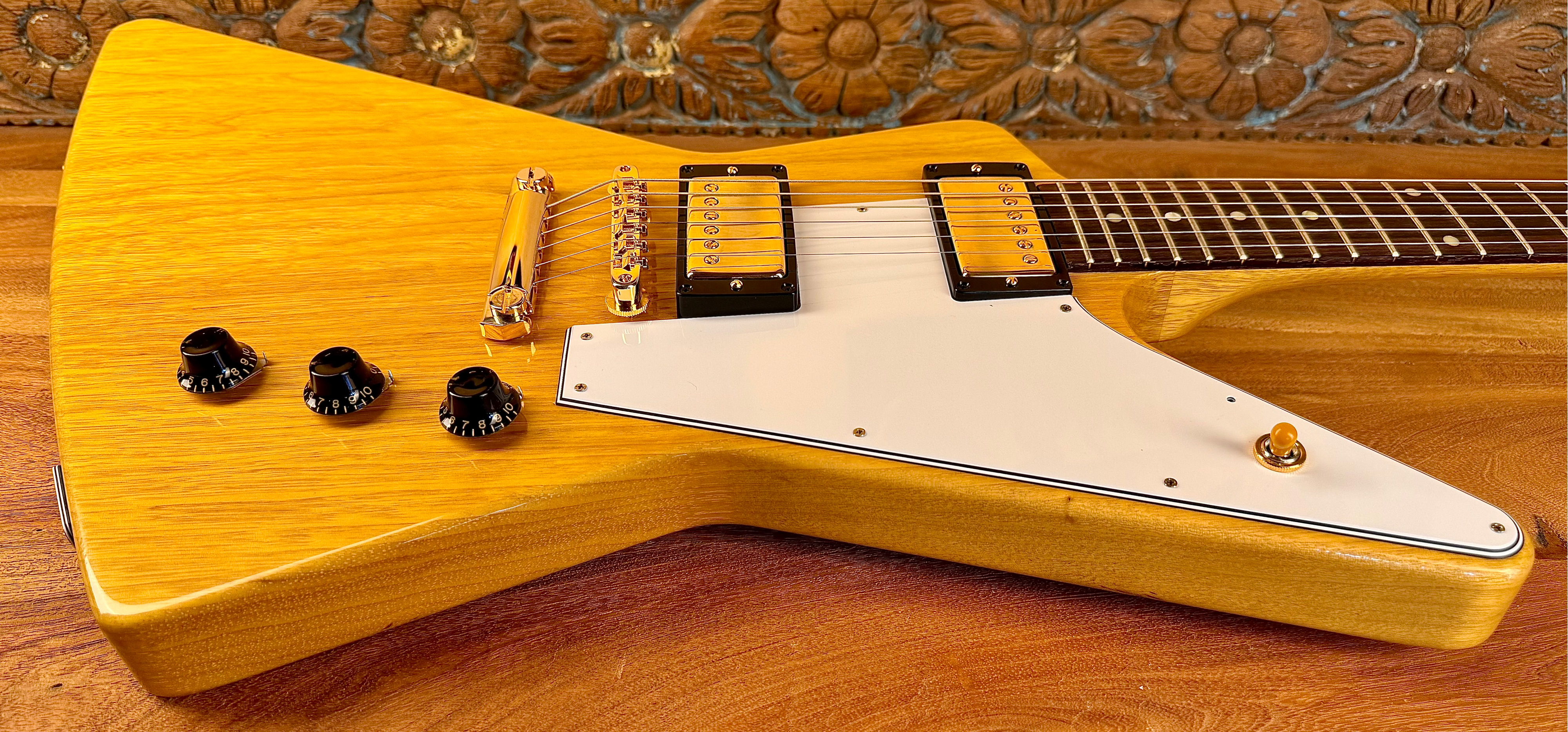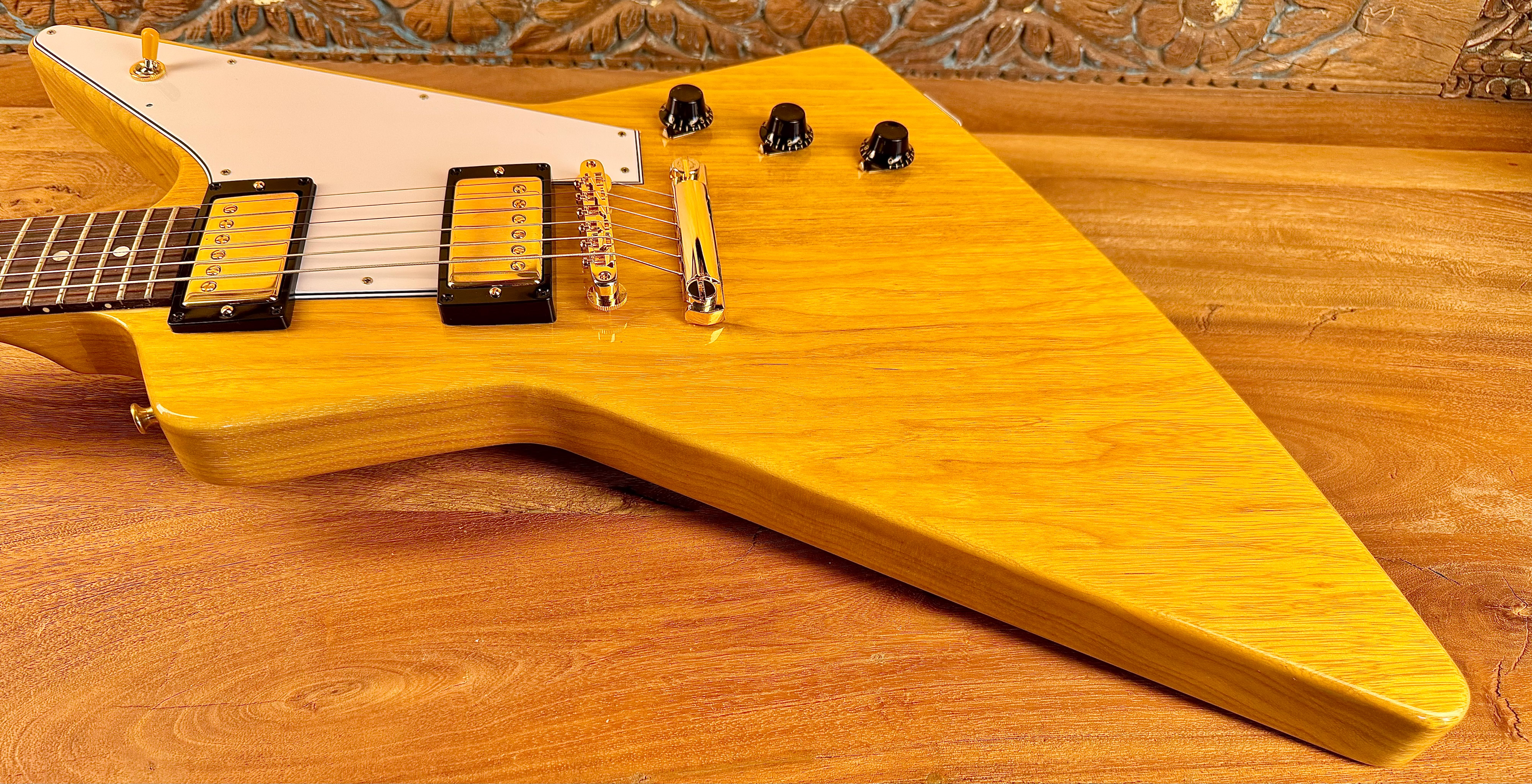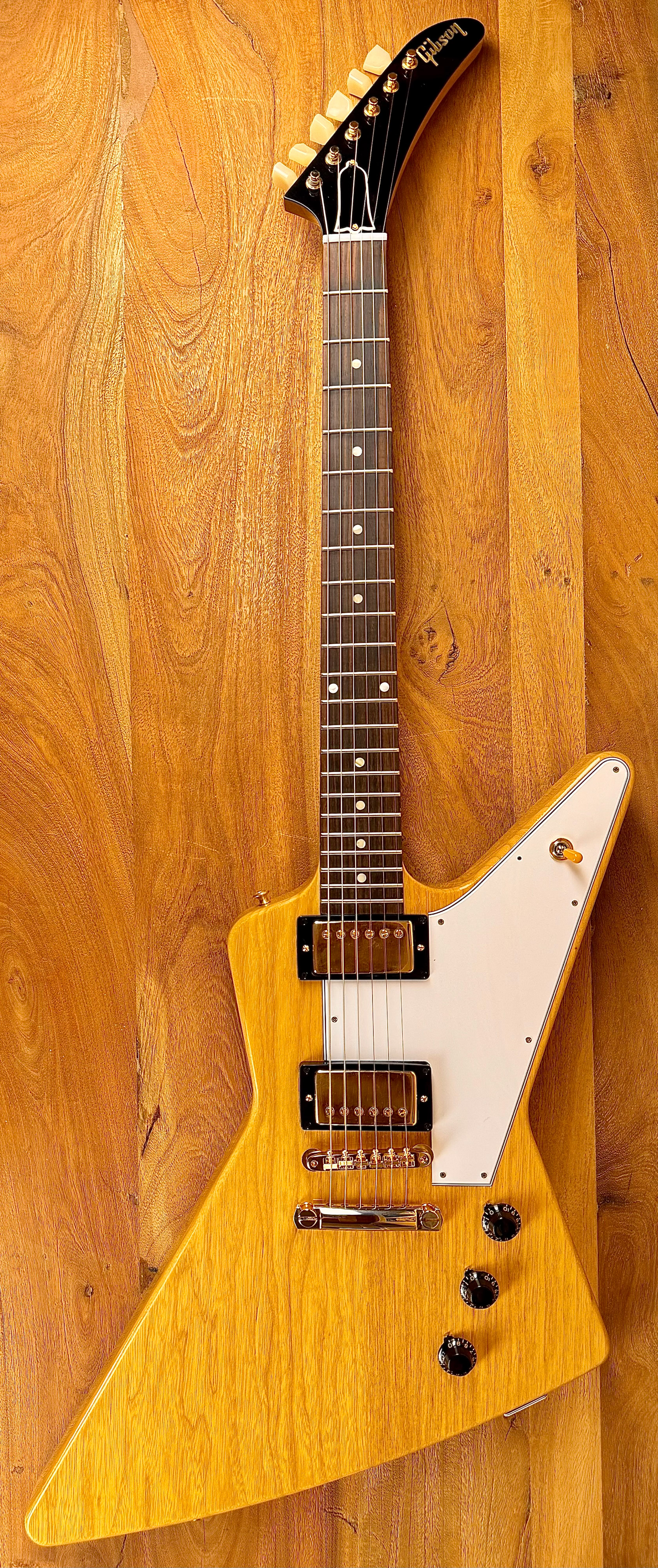 The Gibson Explorer™ was way ahead of its time when it was introduced in 1958, and only 19 were shipped that year, but it has become very popular in the years since then. The classic vintage Explorer features have been carefully recreated in this Historic Reissue model. Featuring an ABR-1 bridge and Stop Bar tailpiece, a Korina body, Custombucker pickups, Korina neck, Indian rosewood fretboard, two volume and one tone control with CTS® pots and a phone book capacitor, gold hardware, Kluson® tuners, and a 4-ply pickguard. A historically accurate case is included, with a classic brown exterior and plush pink interior.