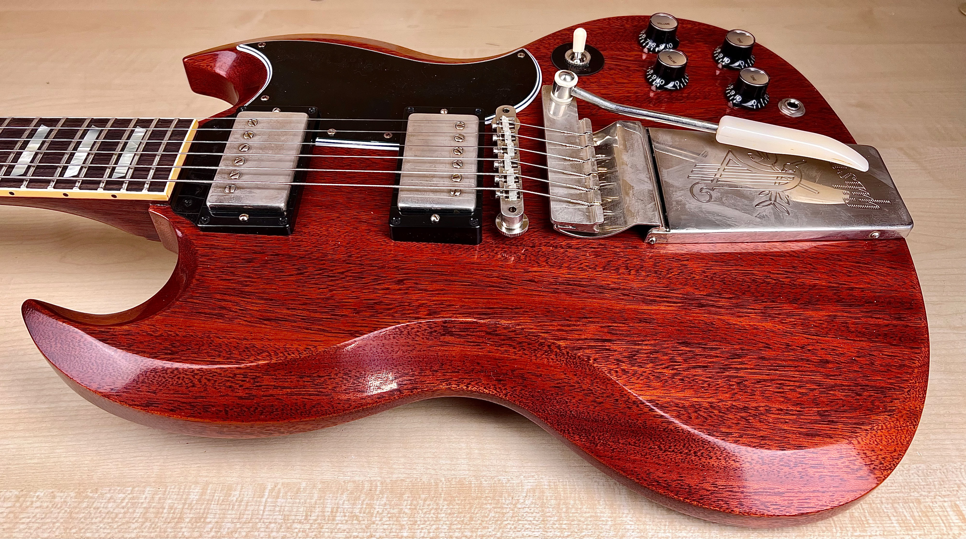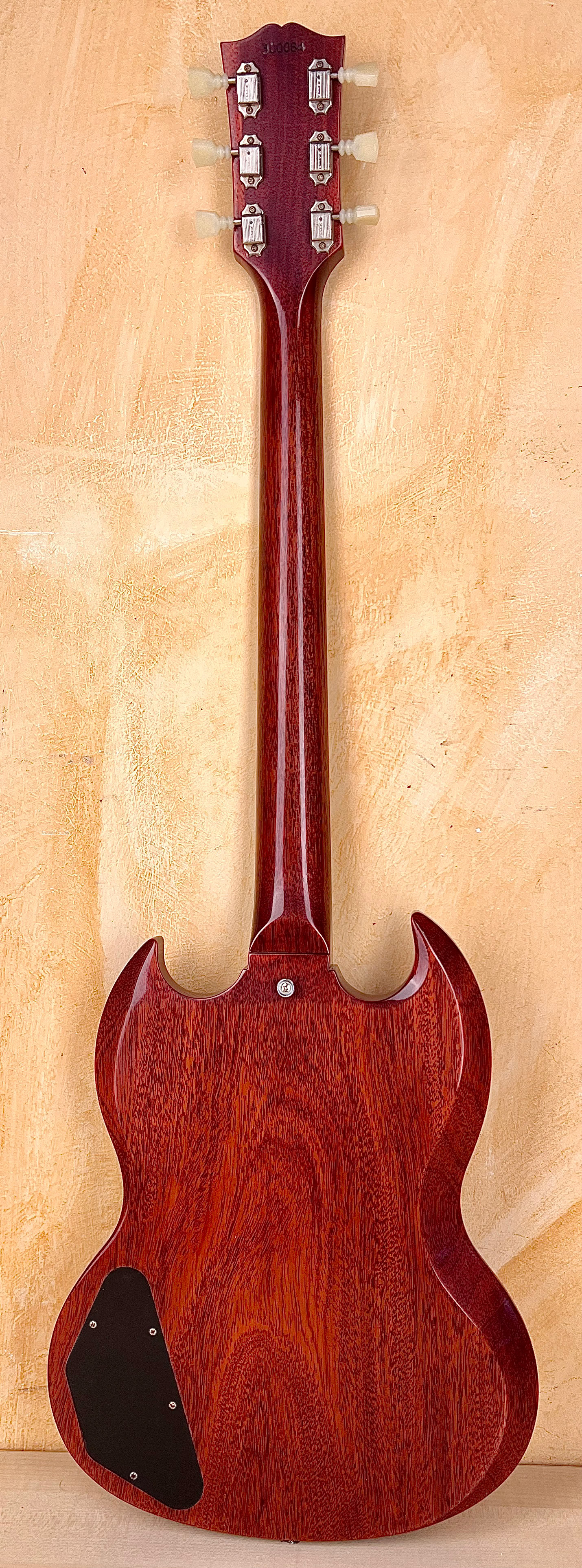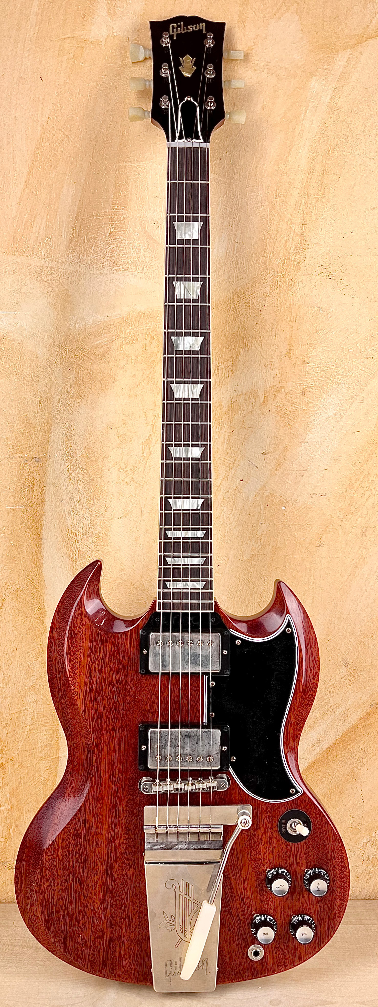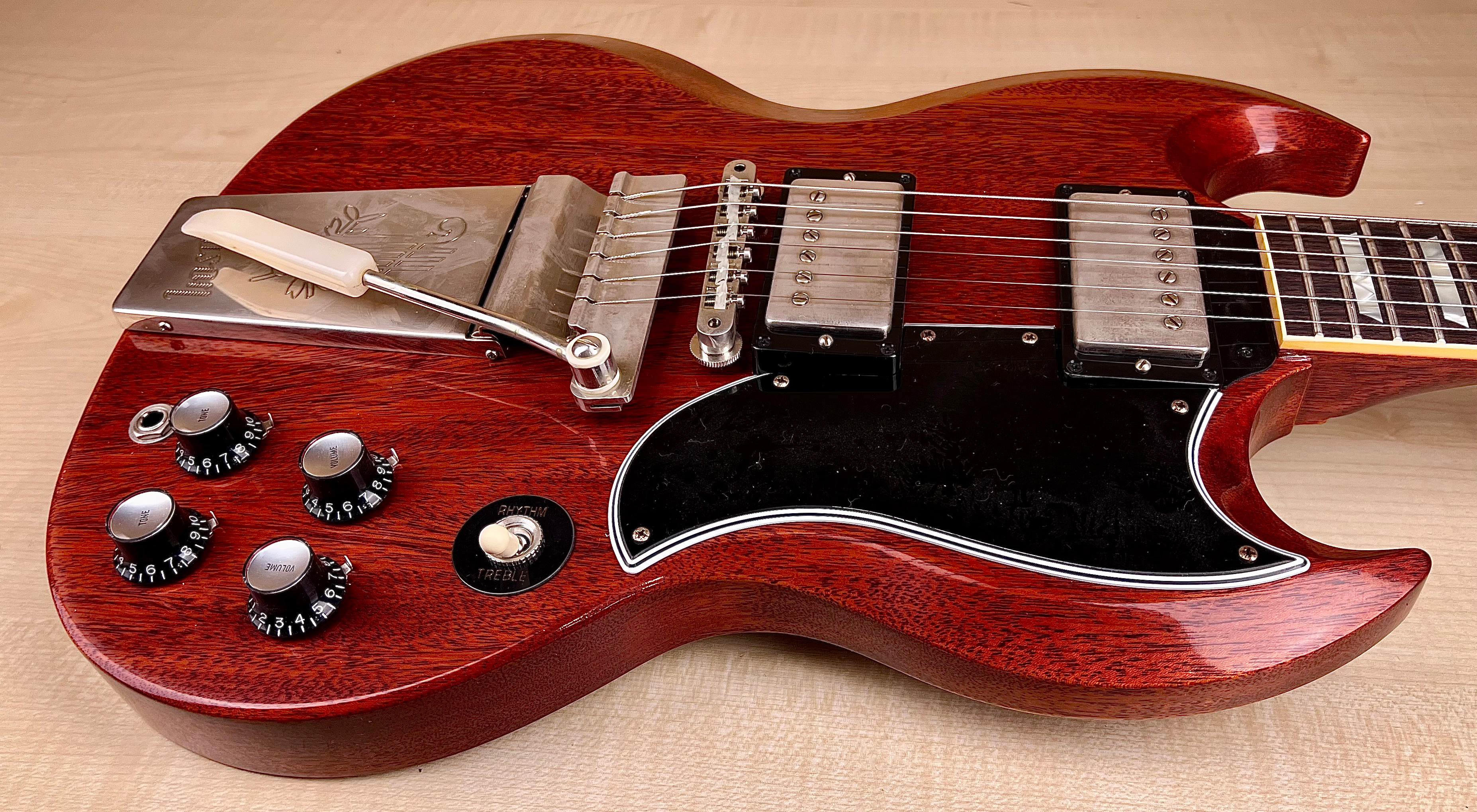 Regardless of the fact that George Harrison and Eric Clapton rocked a '64 SG™ Standard, that model year was clearly a standout for SGs in general. The clunky side-pull vibrato had been replaced by the dependable Maestro™ Vibrola. The neck profiles had increased in size, resembling the profile found on 1959 Les Pauls™. And the balance, playability and look of the SG seemed to come into its own. For all those reasons, the Gibson Custom Shop is proud to present the 1964 SG Standard Reissue. Along with the Maestro Vibrola and chunky neck profile, it has all the hyper-accurate vintage specs one could possibly want -- original construction methods, a real red aniline dye finish, chemically-recreated plastics, replica electronics, and more. The result is perhaps the best looking, feeling and sounding SG Reissue yet. It also features Heavy Aging by the skilled artisans of the Murphy Lab. The Murphy Lab Heavy Aged finish treatment, paired with heavily aged hardware, simulates decades of heavy play wear, giving it the unique character, vibe, and feel of an original example from the Gibson Golden Era.