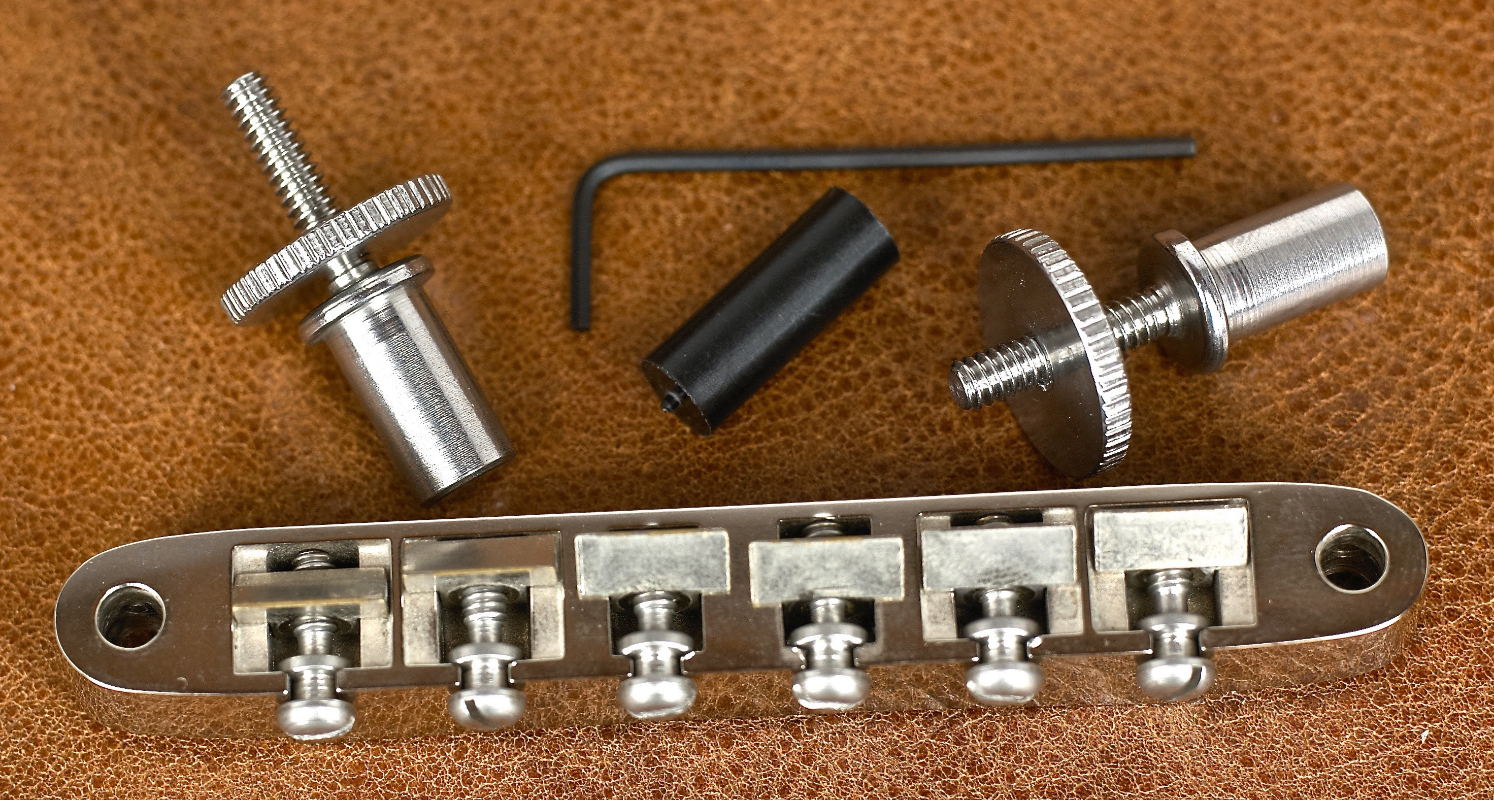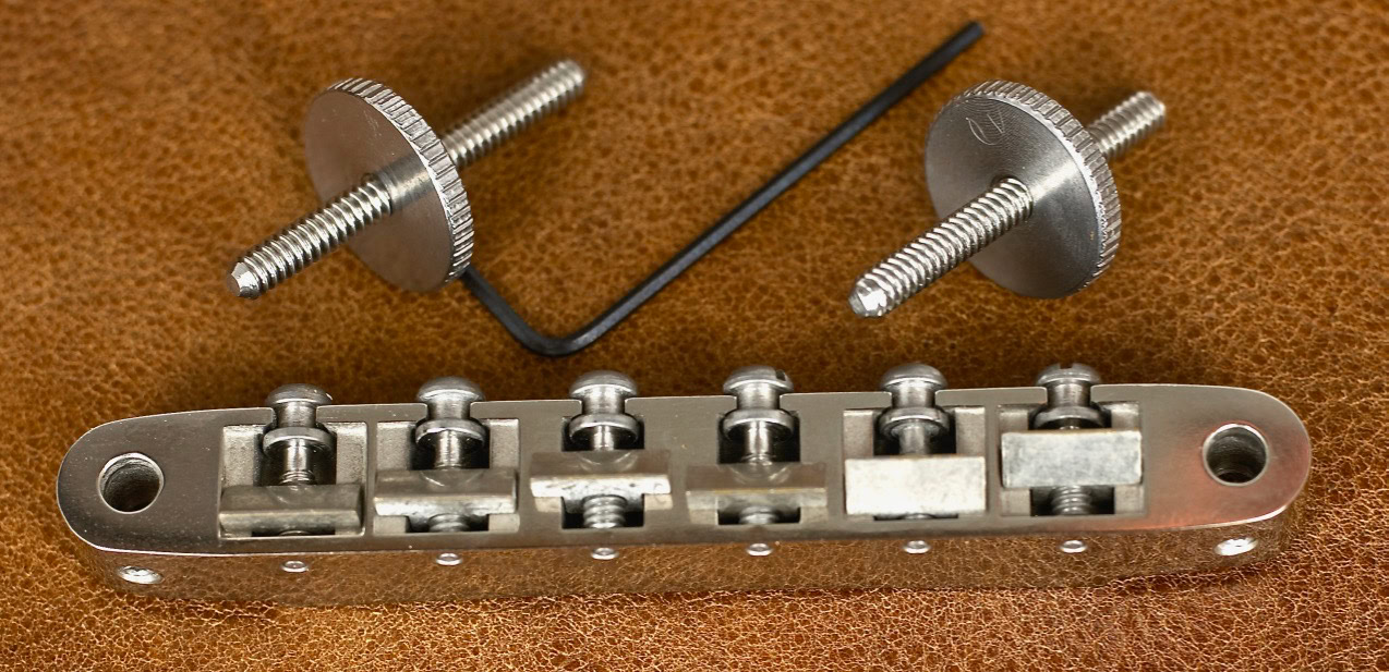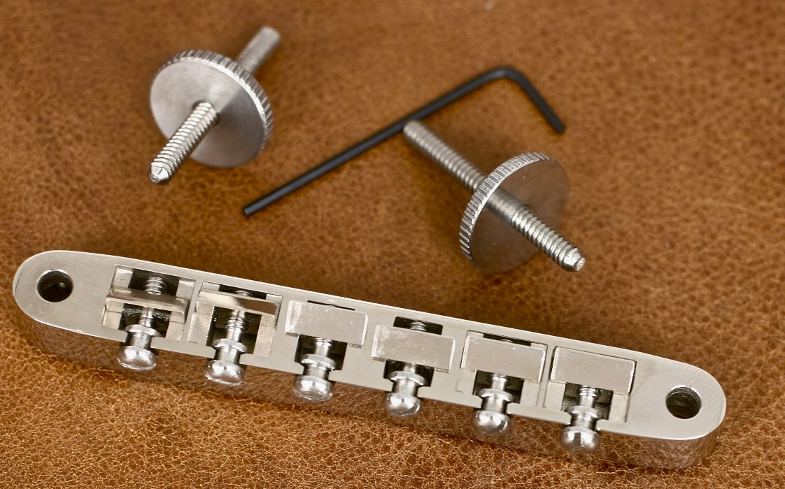 This bridge is a direct replacement on Gibson guitars with an ABR-1 bridge or with our special conversion post on guitars equipped with the Nashville bridge. The body of this bridge is CNC machined from a billet of Cold Rolled alloy steel under rigid quality control standards at every level of production. This is the only alloy Steel bridge available. Gibson and the other aftermarket bridges are cast from a zinc alloy, brass or aluminum which causes heavy dampening to the critical overtones that support the fundamental.