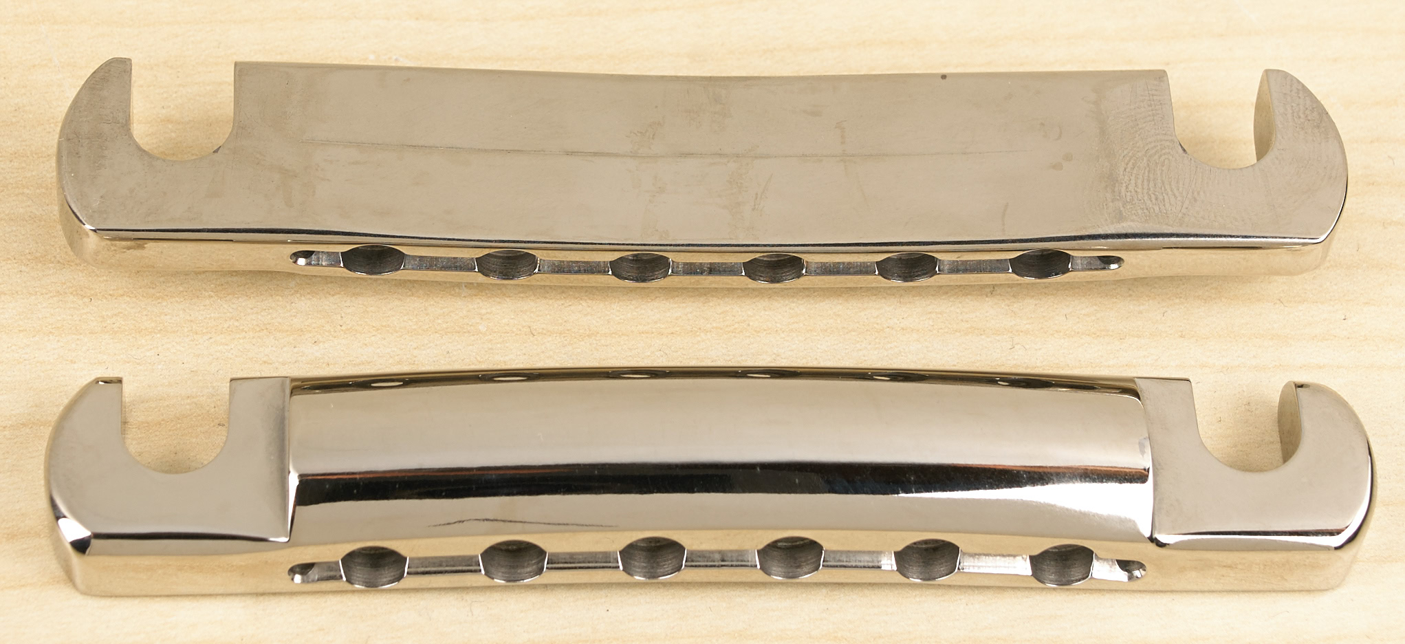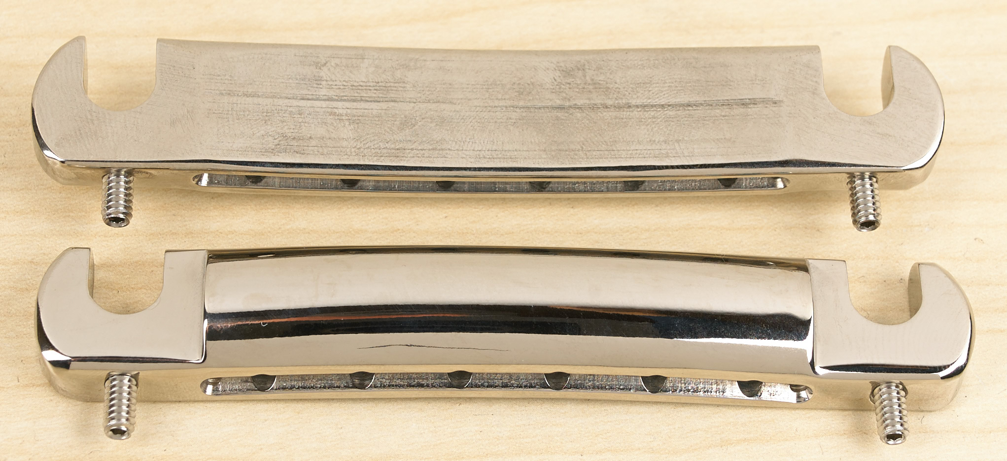 We were concerned with maintaining the vintage look. And with the help of customers with original 50's tailpieces we used them as guides. After machining all the tailpiece are hand sanded and polished to recreate the same feel and look of originals. We do not purposely try to recreate the flaws and lack of craftmanship that so many of the originals exhibit. Having said that, we do not try to make them look perfect and exact from part to part. They all have their own individuallity depending on which one of us was doing the handwork. They are only available in nickel plating, and unlike the other aftermarket parts where the plating is piled on producing a cheap looking part, our plating is done with care yielding a graceful finish.
