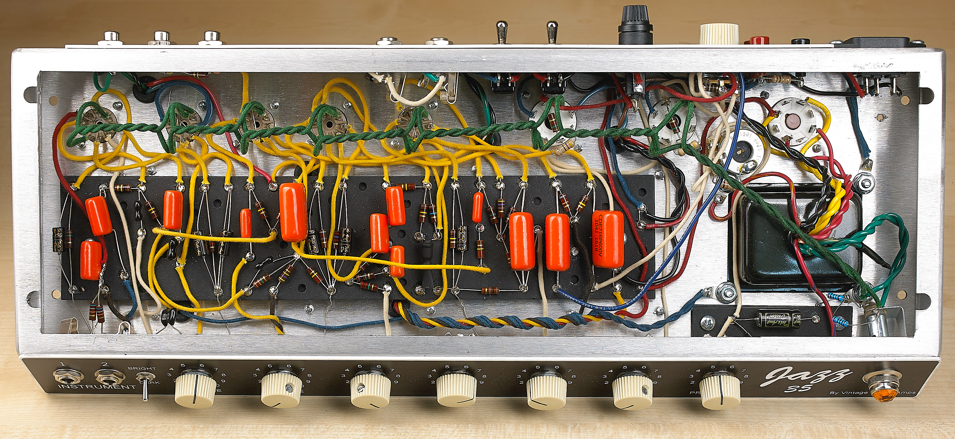 So, as you can see, the Jazz 20 has manyupgrades overthe original Princeton Reverb circuit. As well, all Vintage Sound amps are point-to-point hand-wired using top quality filter caps and electrolytics, carbon comp resistors, Orange Drop tone caps, solid core push back wire, and custom transformers that are hand wound in the USA.